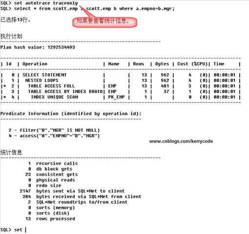 SQL>SET AUTOTRACE TRACEONLY STAT --这样设置只包含有统计信息