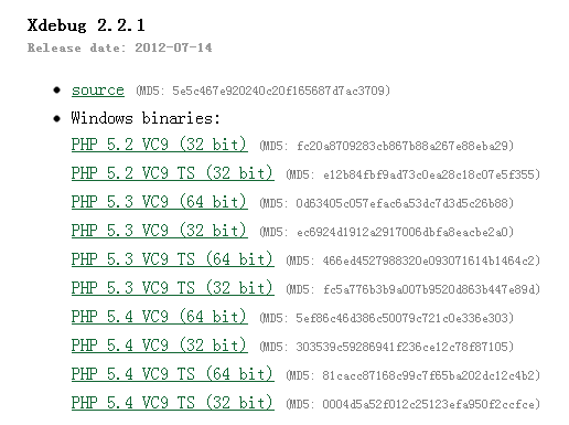 这个是xdebug2.2.1的所有版本,拿第一个举例,它是适用于php 5.2版本,使用vc9编译到32位环境中非线程安全的xdebug,这里的TS就是Thread Safe的意思,所以没有这个标记就是No Thread Safe的意思啦