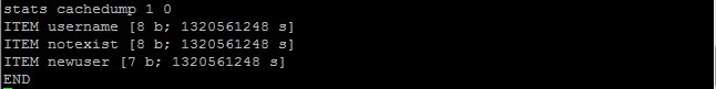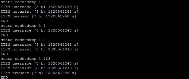 这里slab_id为1,是由2中的stats items返回的结果(STAT items后面的数字)决定的;limit_num看起来好像是返回多少条记录,猜的一点不错, 不过0表示显示出所有记录,而n(n>0)就表示显示n条记录,如果n超过该slab下的所有记录,则结果和0返回的结果一致。