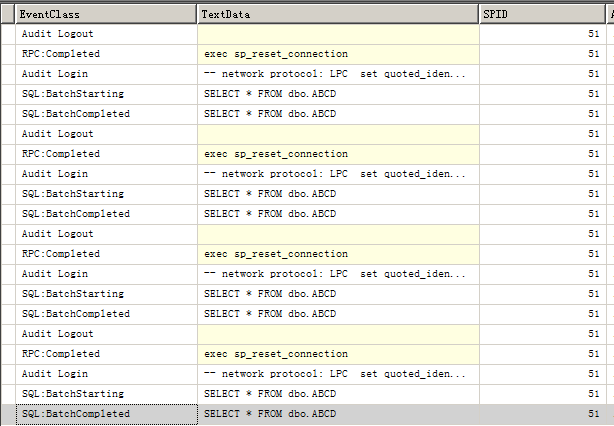 此外,我们在中间等待的10秒还可以看到SP51是不断的,剩下几个连接全部用的是SPID51这个连接,虽然Ado.net Close了好几次,但实际上物理连接是没有中断的。
