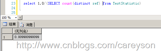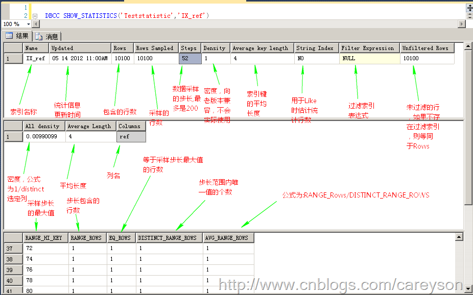 统计信息如何影响查询下面我们通过一个简单的例子来看统计信息是如何影响查询分析器。我建立一个测试表,有两个INT值的列,其中id为自增,ref上建立非聚集索引,插入100条数据,从1到100,再插入9900条等于100的数据。图1中的统计信息就是示例数据的统计信息。