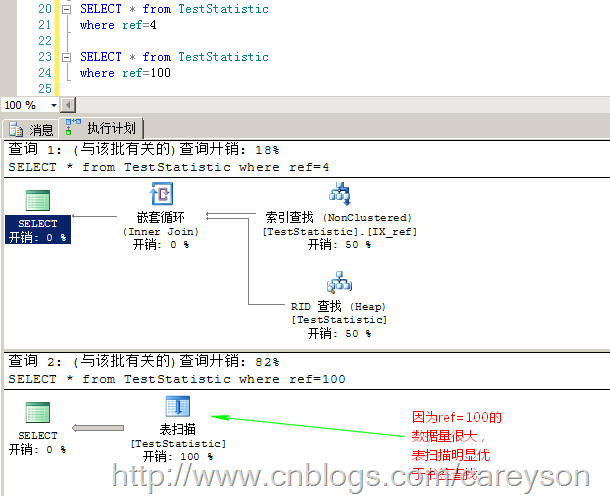 此时,我where后使用ref值作为查询条件,但是给定不同的值,我们可以看出根据统计信息,查询分析器做出了不同的选择,如图2所示。
