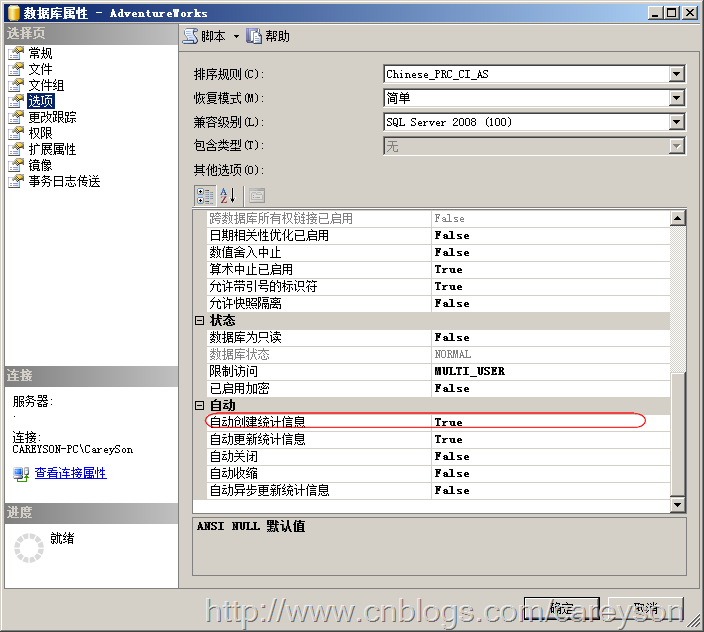列级统计信息SQL Server还可以针对不属于任何索引的列创建统计信息来帮助查询分析器获取”估计的行数“.当我们开启数据库级别的选项“自动创建统计信息”如图6所示。