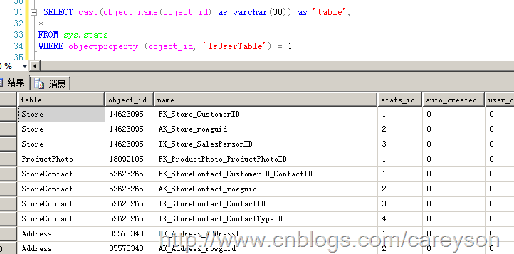创建统计信息的成本超过生成查询计划的成本 当SQL Server忙时不会自动生成统计信息我们可以通过系统视图sys.stats来查看这些统计信息,如图7所示。