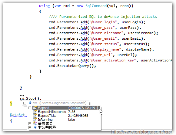 接下来,让我们简单的测试一下代码执行时间,首先我们在代码中添加方法Stopwatch.StartNew()和Stopwatch.Stop()来计算写入代码的执行时间,具体代码如下: