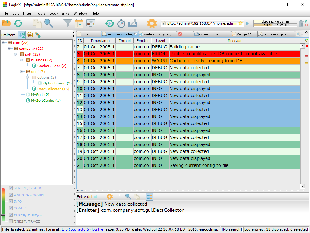 LogMX 是为开发商和管理员的一个直观和易于使用的日志文件跟踪的工具,提供一个友好且强大图形界面。 LogMX可以显示日志,并且跟踪文件内容,并进行日志内容过滤。