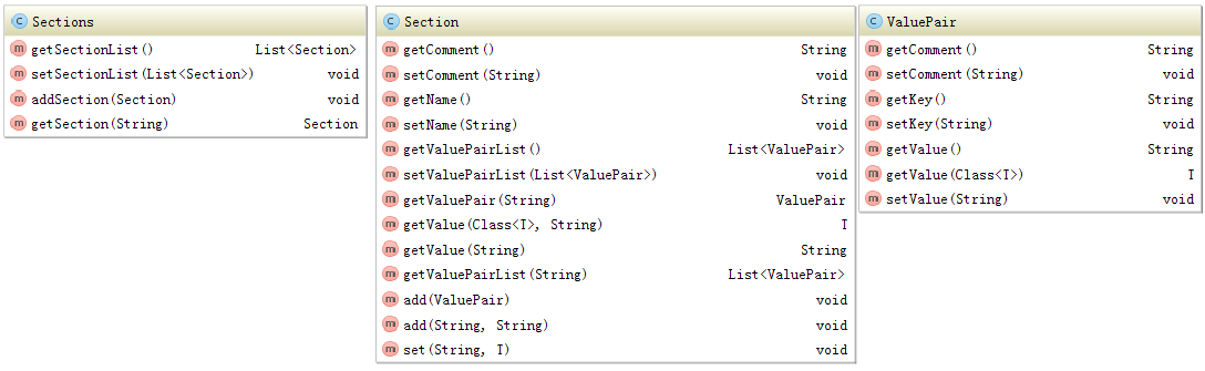 对于INI的描述,采用了三个类来进行描述,一个INI文件对应于一个Sections,一个Sections可以包含多个Section,暂时不支持同名Section。
