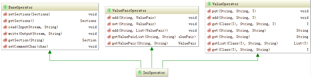 对INI结构的操作对于INI的操作,最后是由IniOperator进行的,它从三个接口继承而来,三个接口分别对应于基础操作,值对操作和值操作。