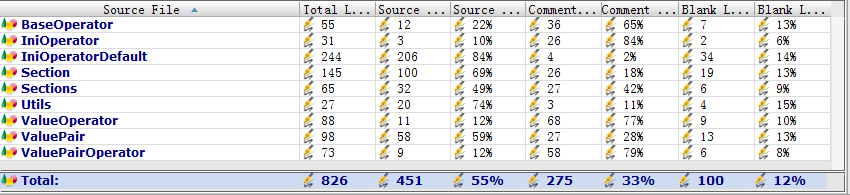 代码实现统计从上面的统计看,总共的代码行数是451行--一开始没有加对注释的支持,只有300行左右,由于增加了注释方面的支持,容量增加了50%。