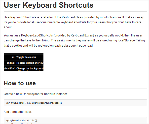 本文导语: UserKeyboardShortcuts 是重构了 mootools-more 提供的键盘类,提供给用户本地自定义的键盘快捷键,不需要用户做过多的操作。用户只需要用 Keyboard.addShortcuts ( Keyboard.Extras提供的 )来改变他们的快捷键。UserKeyboardShortcuts 使用 localStorage ...