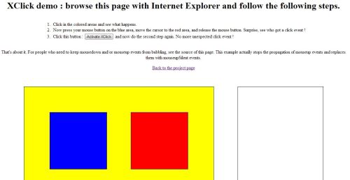 X-clicks 是人们所熟知的, 在 Internet Explorer 上按下鼠标和松开鼠标会出现两种不同的风格元素,是意料不到的单击事件。Louis AMELINE 开发的 XClick 就是为了避免这种混乱,它会提前告诉用户将要点击的事件。在线演示